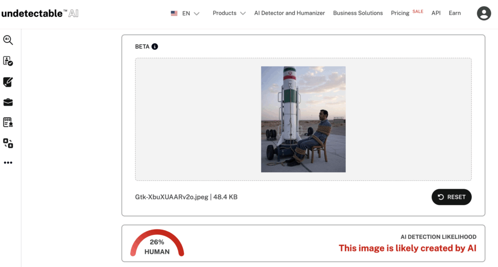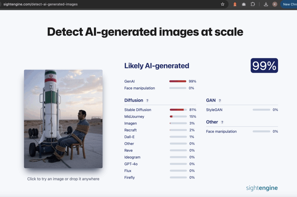 Με τη χρήση εργαλείων για την ανίχνευση φωτογραφιών που είναι αποτέλεσμα τεχνικής επεξεργασίας ή προϊόν AI, διαπιστώθηκε με «απόλυτη βεβαιότητα» ότι η εικόνα δημιουργήθηκε με πεογράμματα τεχνητής νοημοσύνης. Αυτό αποδεικνύει ότι δεν πρόκειται για αυθεντική φωτογραφία αλλά για ψηφιακή σύνθεση.